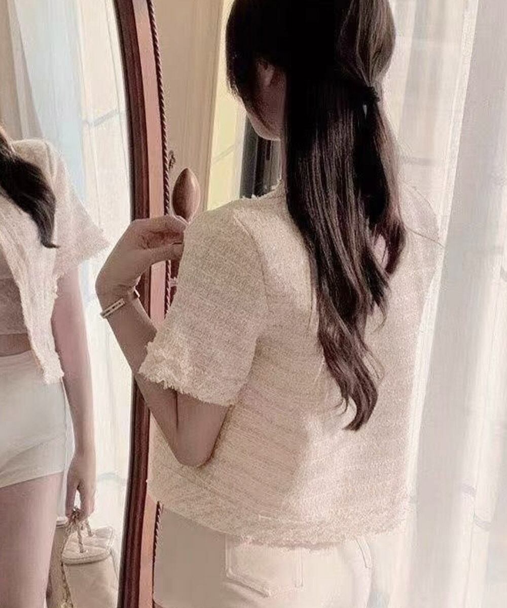 ぜひ、このツイード調ジャケットを使って、上品で華やかな夏のコーディネートをお楽しみください!