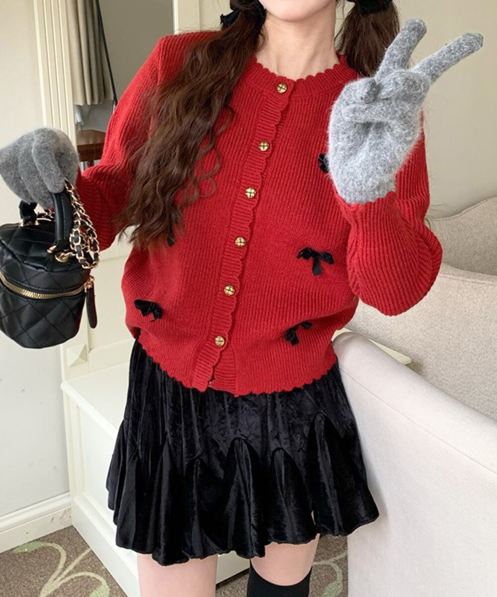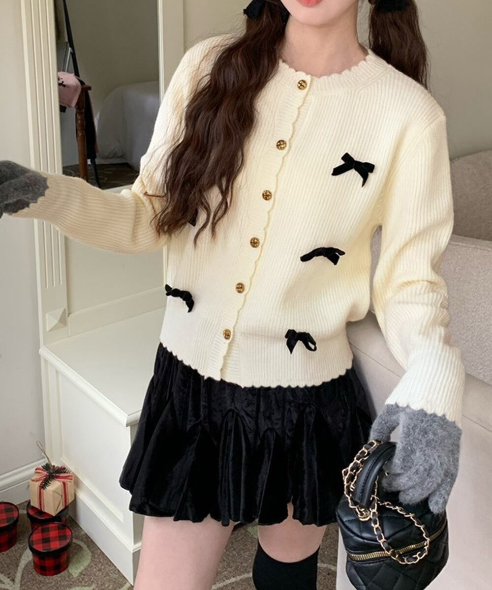 【国内倉庫(関東地区)発送[通常発送]】ニットカーディガン リボン飾り 秋冬 ニット