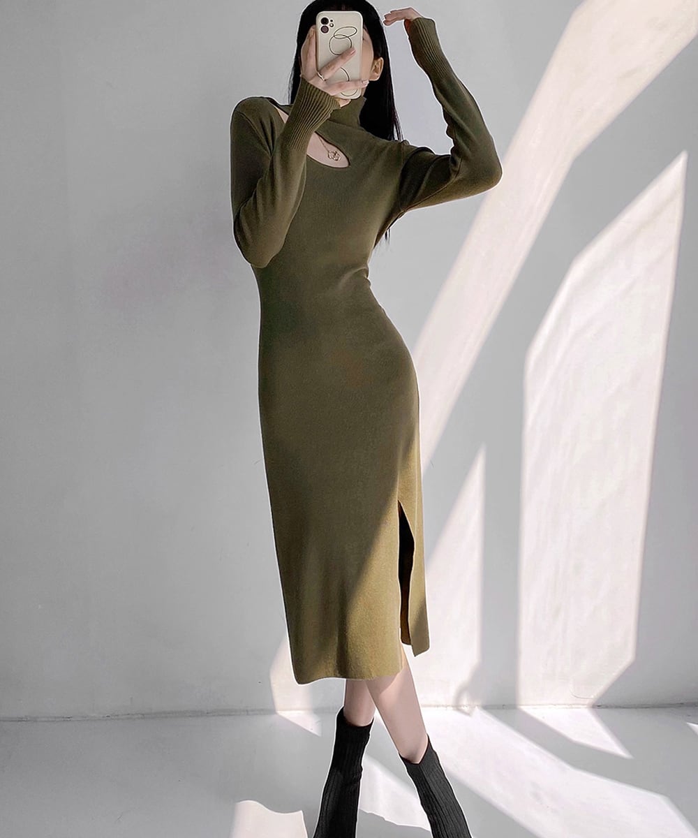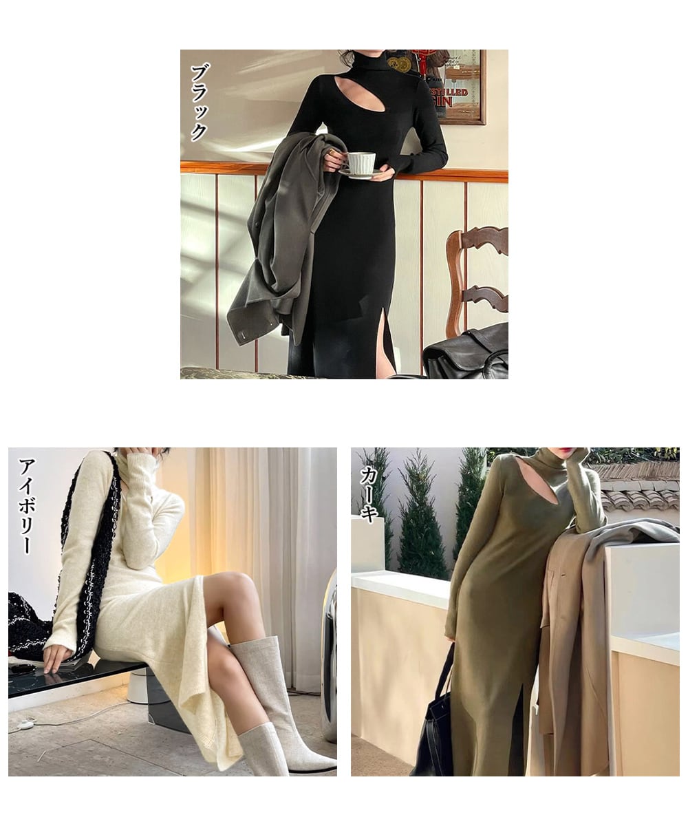 レディース カットアウト ロングワンピース タートルネック タイトワンピース 秋冬 長袖 セクシー ボディコンワンピ 細見え感 ワンピース 冬 ハイネック ニット 着やせ感 ワンピ 無地