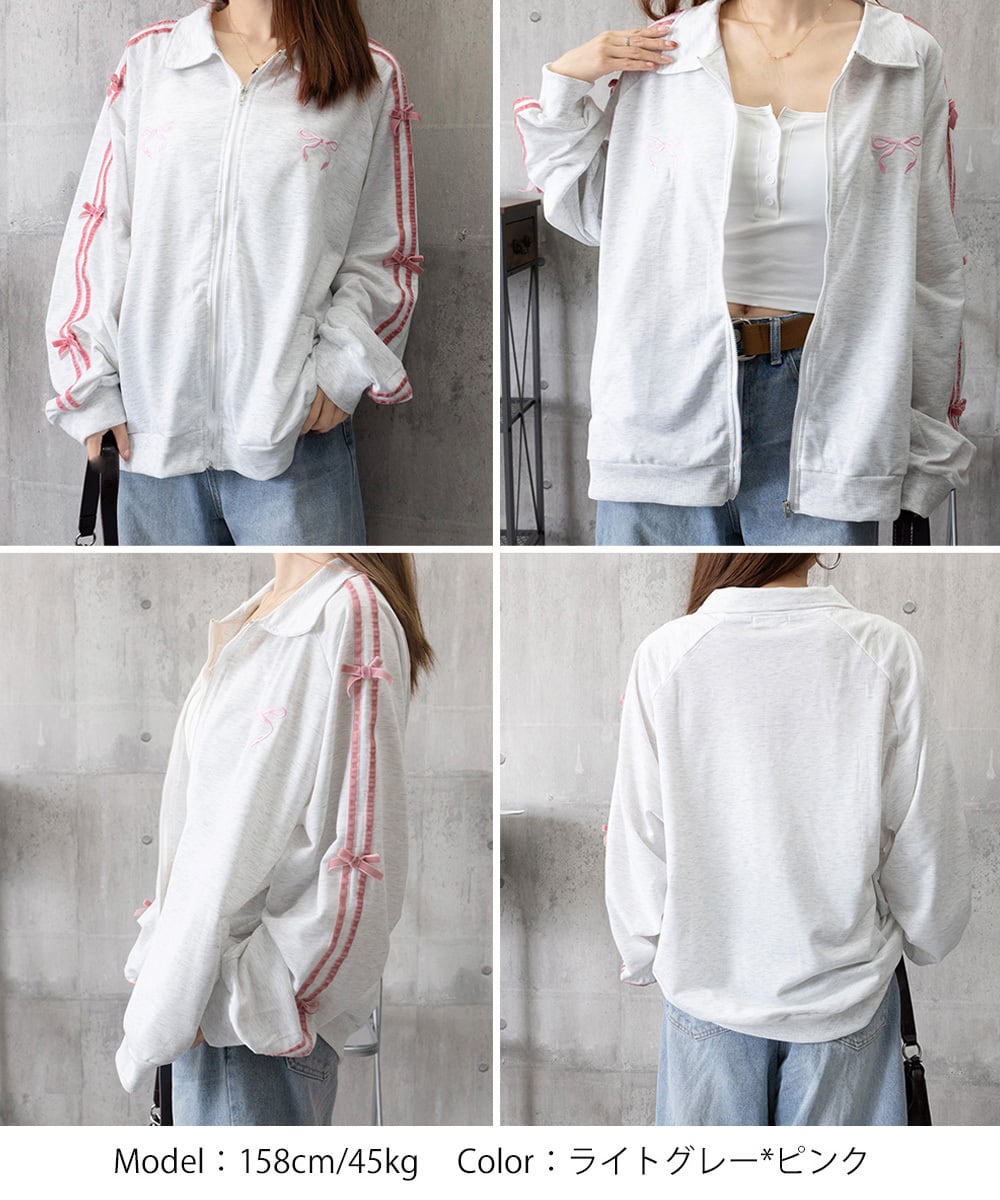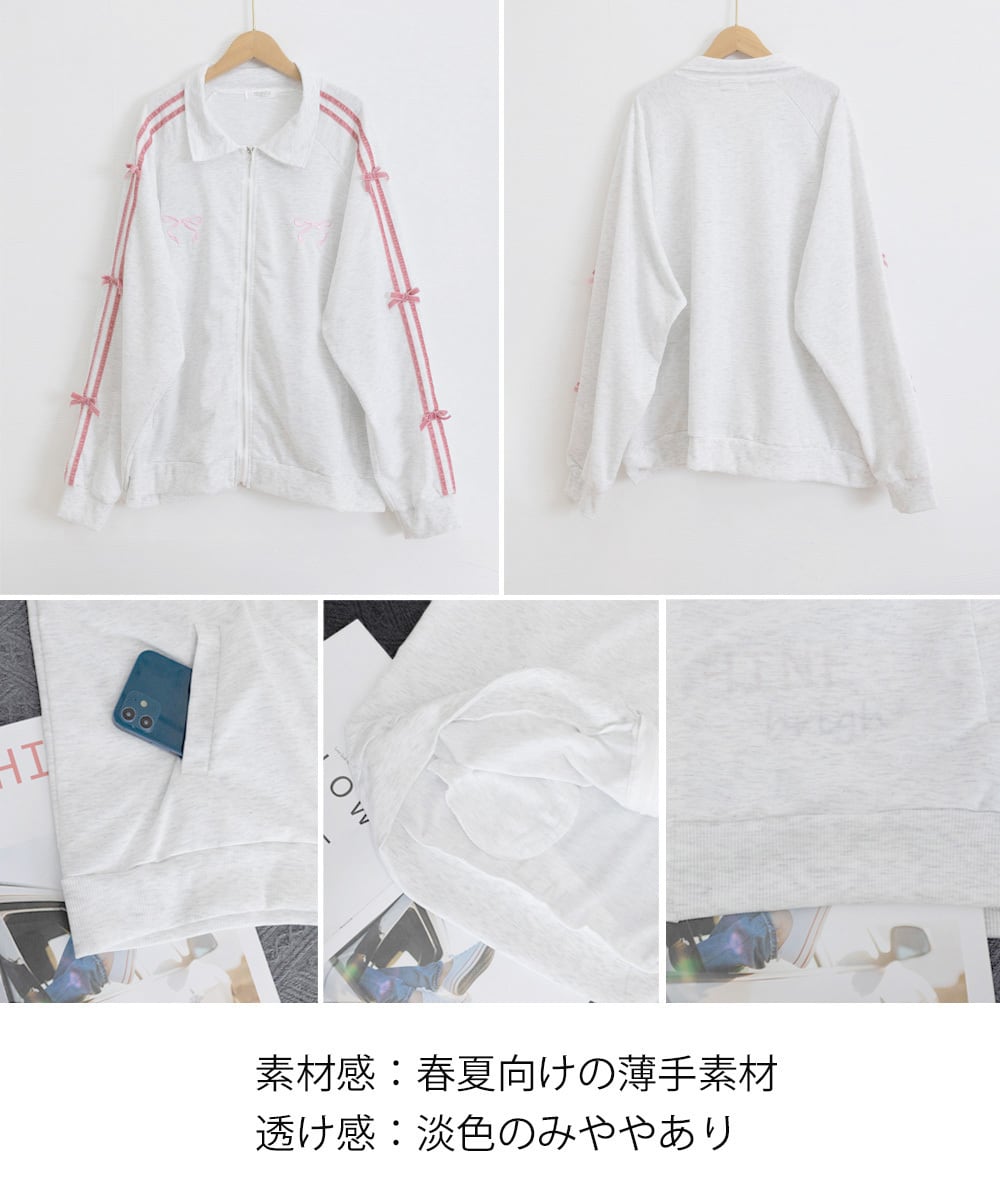 レディース ガーリー リボン ジャケット 袖ライン スウェット 春秋 薄手 ワンポイント スポーティ カジュアル 大人可愛い感 刺しゅう ブルゾン ライトアウター 長袖