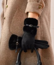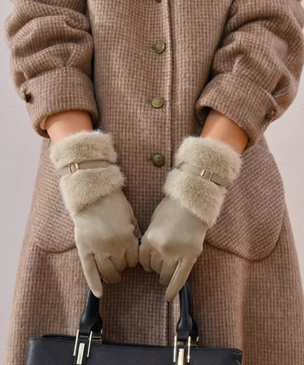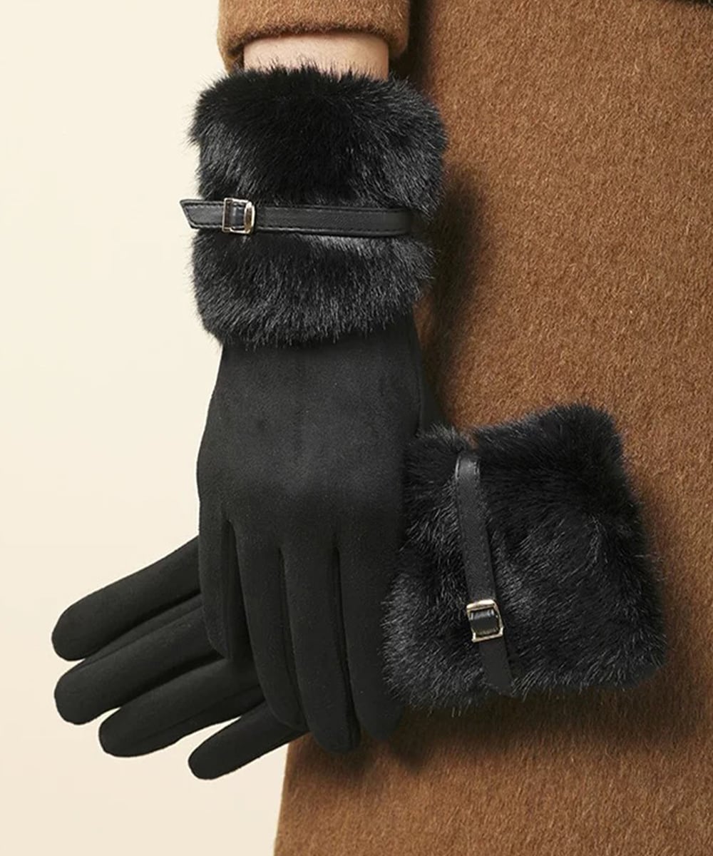 エコファーとベルトのデザインが手元を華やかに演出し、冬のおしゃれを楽しむことができます。
