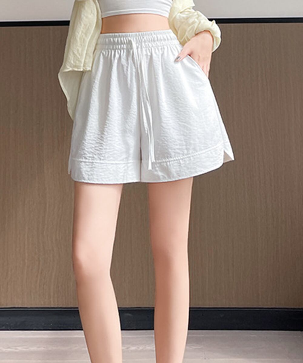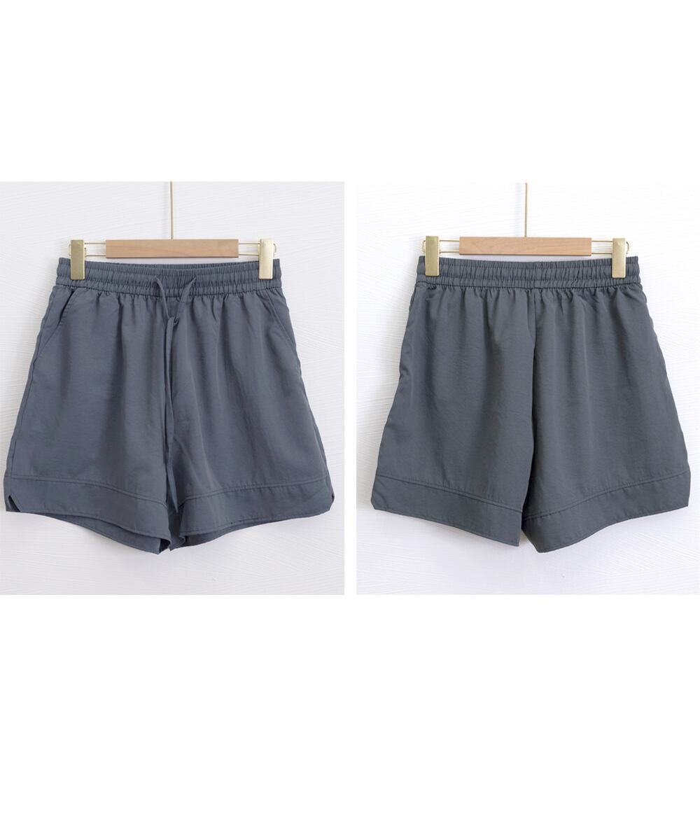短パン ハイウエスト 韓国ファッション風 夏服 Aライン ボトムス ポケット付き 大人カジュアル感 半ズボン 楽ちん感 ゆったり感 ハーフパンツ 膝上丈 パンツ 涼しい感 薄手 イージーパンツ ルームウェア 無地