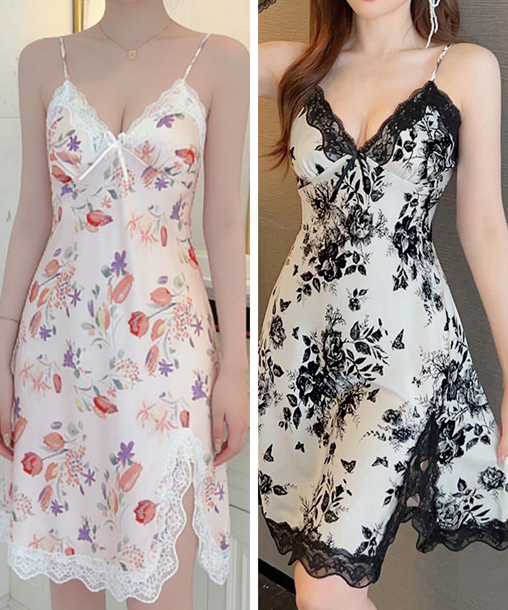 ルームウェア レディース 滑らか感 セクシー 花柄 キャミワンピ 体型カバー レース切り替え ハート柄 Vネック スリット入り 快適着心地感 ワンピ フェミニン パジャマ 部屋着 薄手