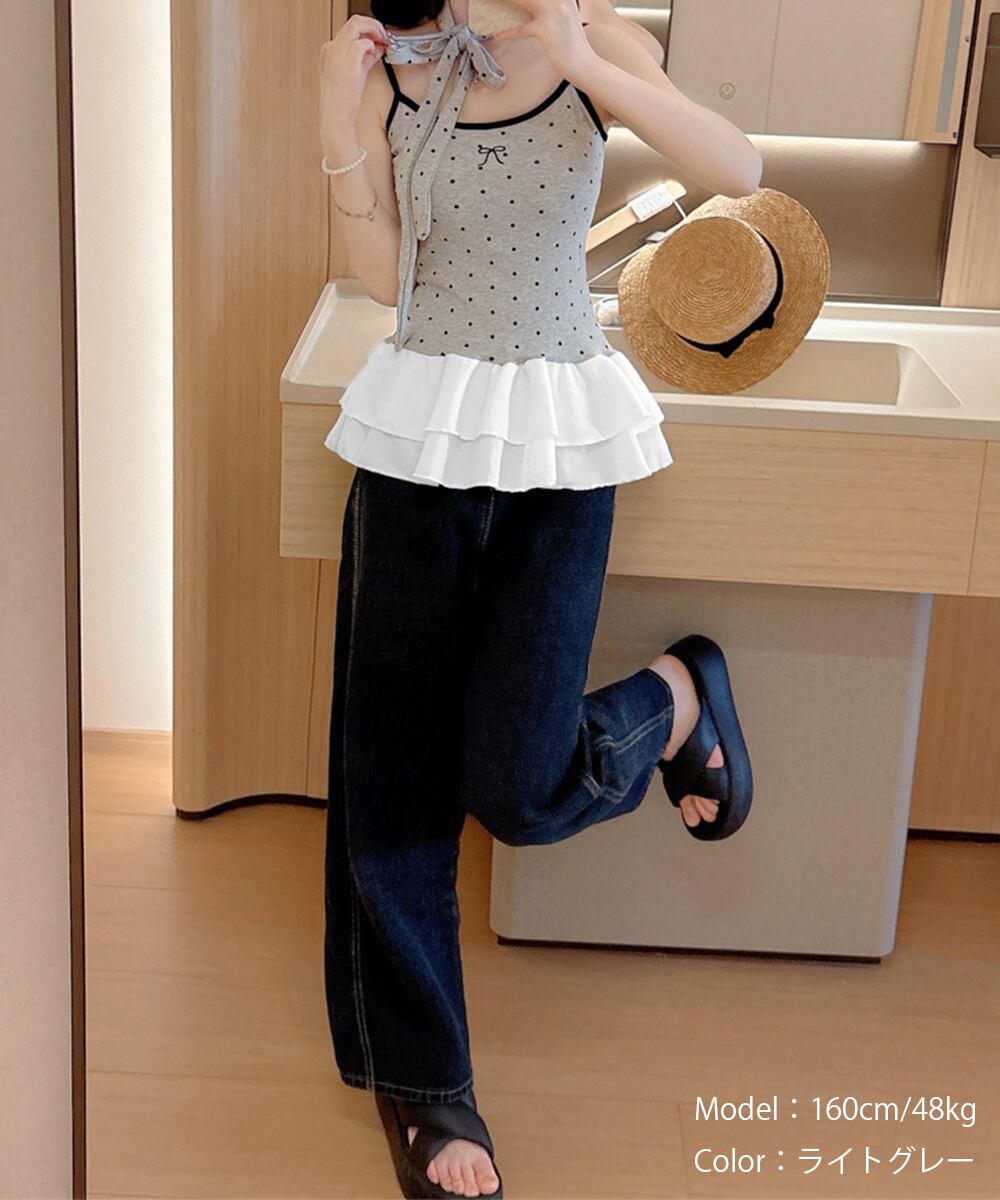 可愛らしいドット柄とネックリボンが印象的なフリルティアードキャミソールです!