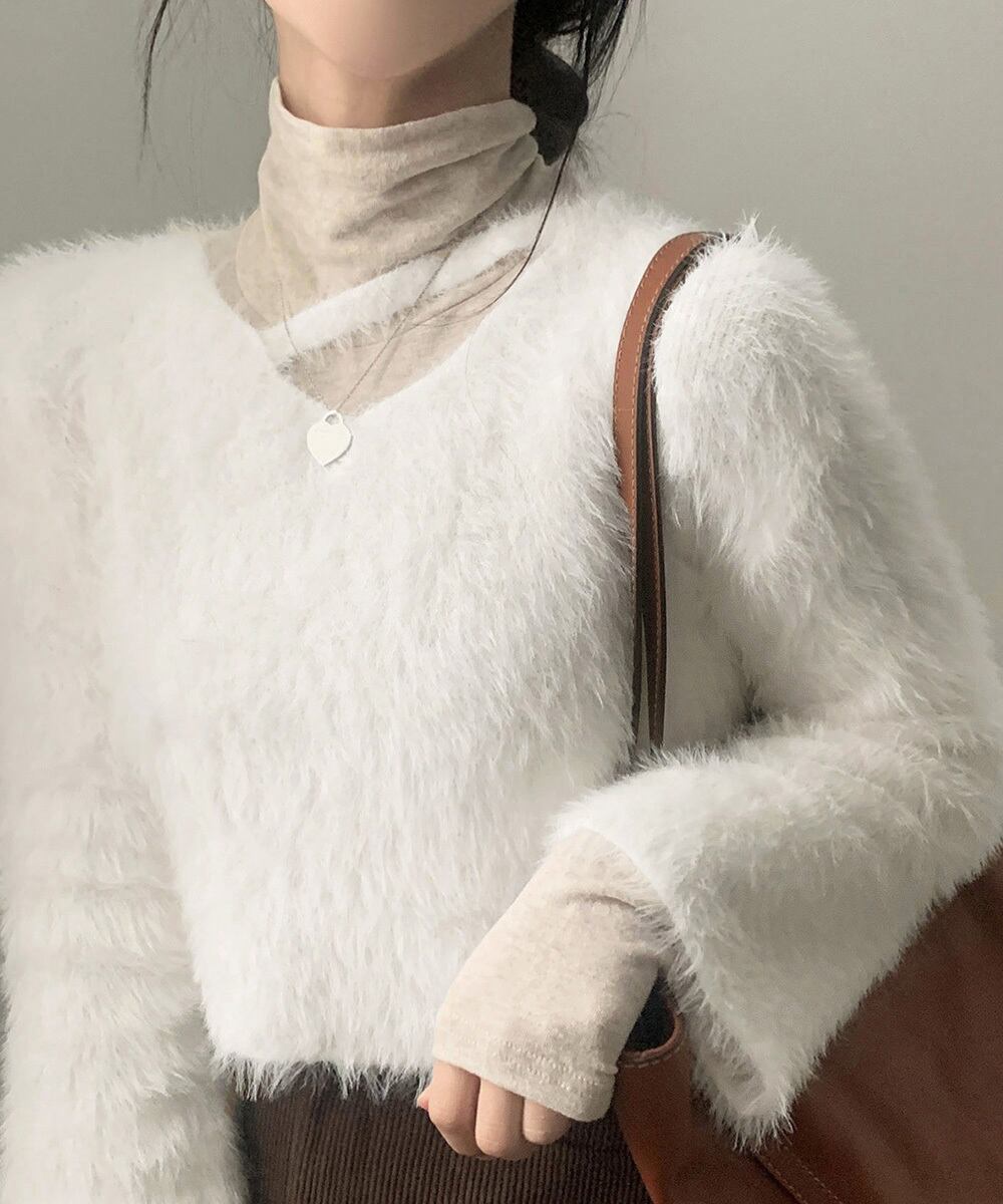 【国内倉庫(関東地区)発送[通常発送]】クロップド丈 シャギー ニット Vネック 長袖