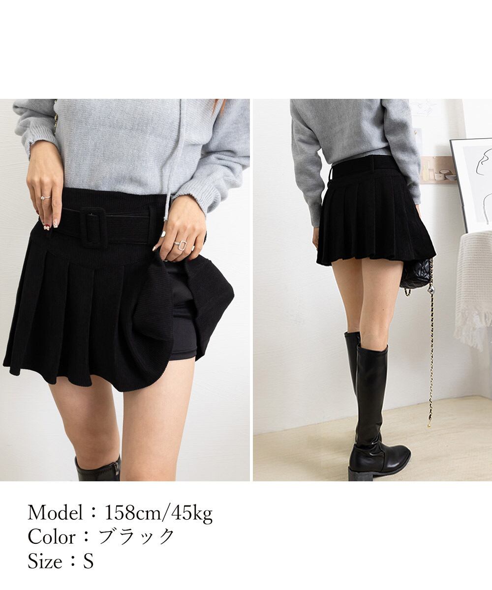 レディース ハイウエスト ショート丈 スカート ベルト付き 韓国ファッション風 Aライン インナーパンツ付き 着やせ感 ボトムス 膝上丈 美脚見え感 フレアスカート 秋冬 台形スカート 脚長見え感